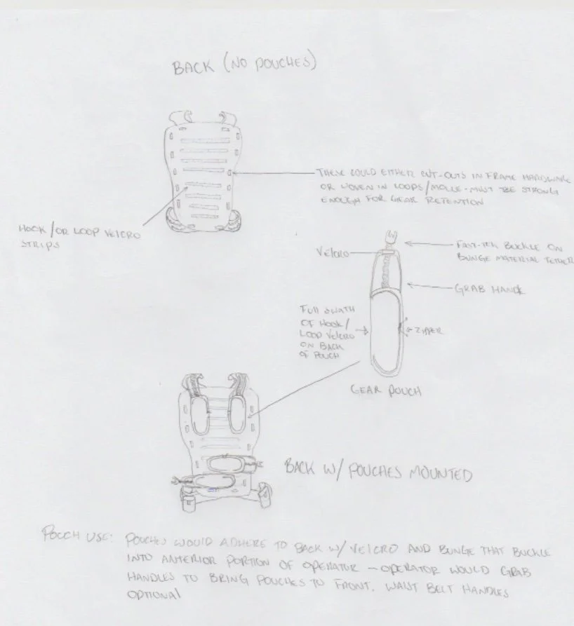 This project began from a sketch in 2017 calling out the growing requirements for more and more gear to be carried, the rising rate of injuries that came with that additional gear, and the lack of innovation in ways to carry it.