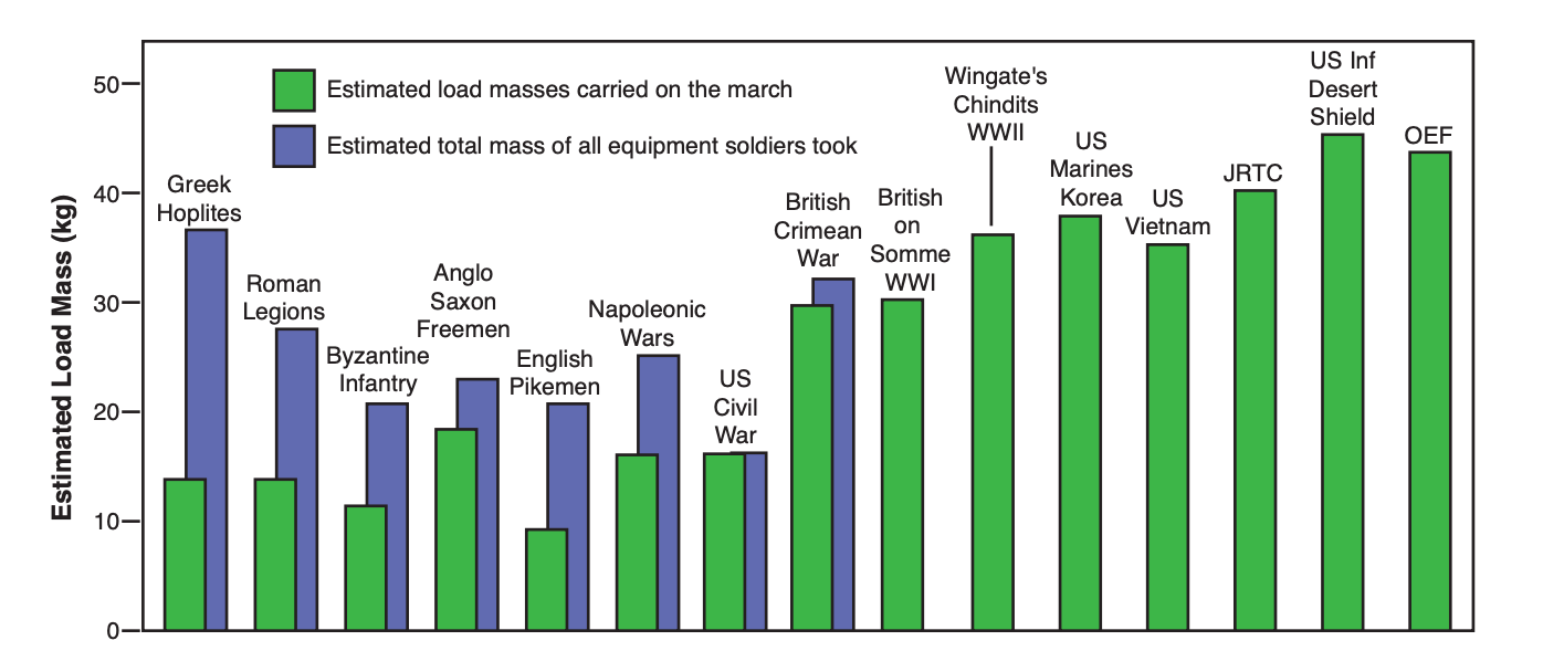 “LOAD CARRIAGE IN MILITARY OPERATIONS: A REVIEW OF HISTORICAL, PHYSIOLOGICAL, BIOMECHANICAL, AND MEDICAL ASPECTS”; JOSEPH KNAPIK, ScD; and KATY REYNOLDS, MD;2010